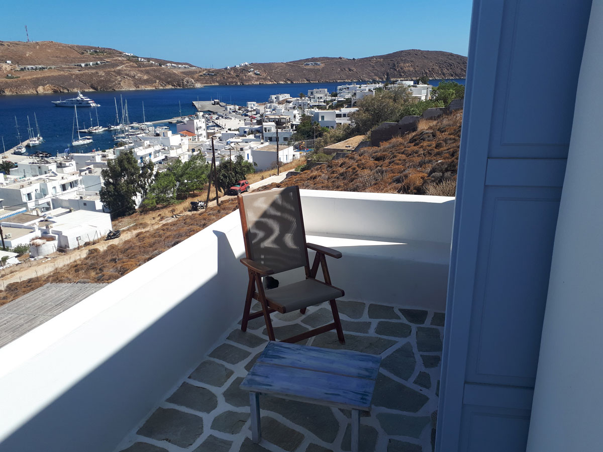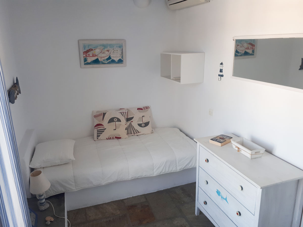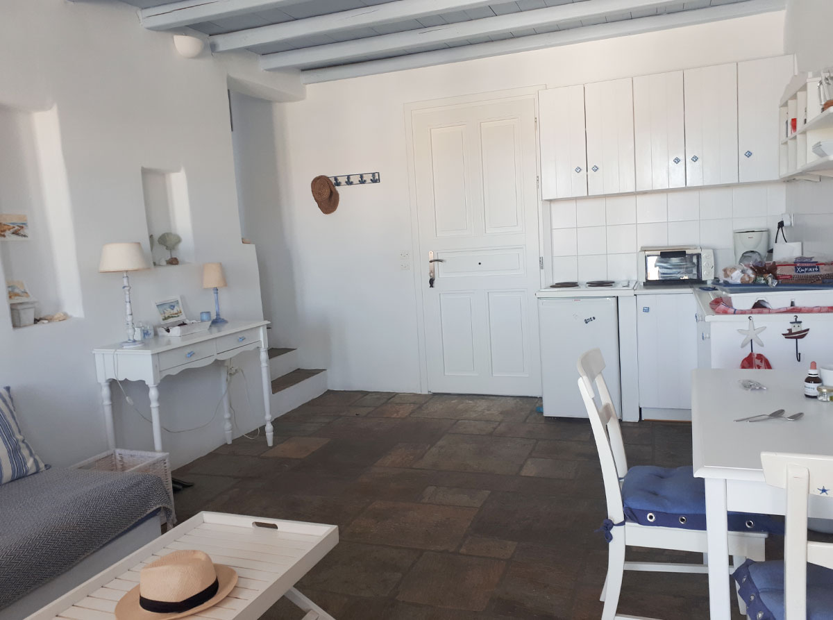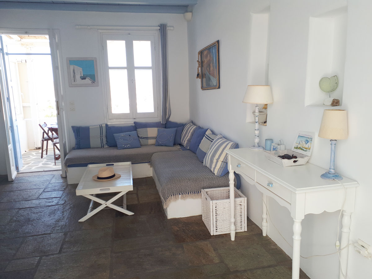 Confortevole appartamento in complesso di case in stile cicladico a Livadi: 1 camera da letto matrimoniale, 1 camera da letto con letto singolo, bagno, soggiorno con cucina attrezzata e terrazza con vista sul mare e su Chora. A 100 metri dal centro e a 250 metri dalle spiagge di Livadakia e Avlomonas.