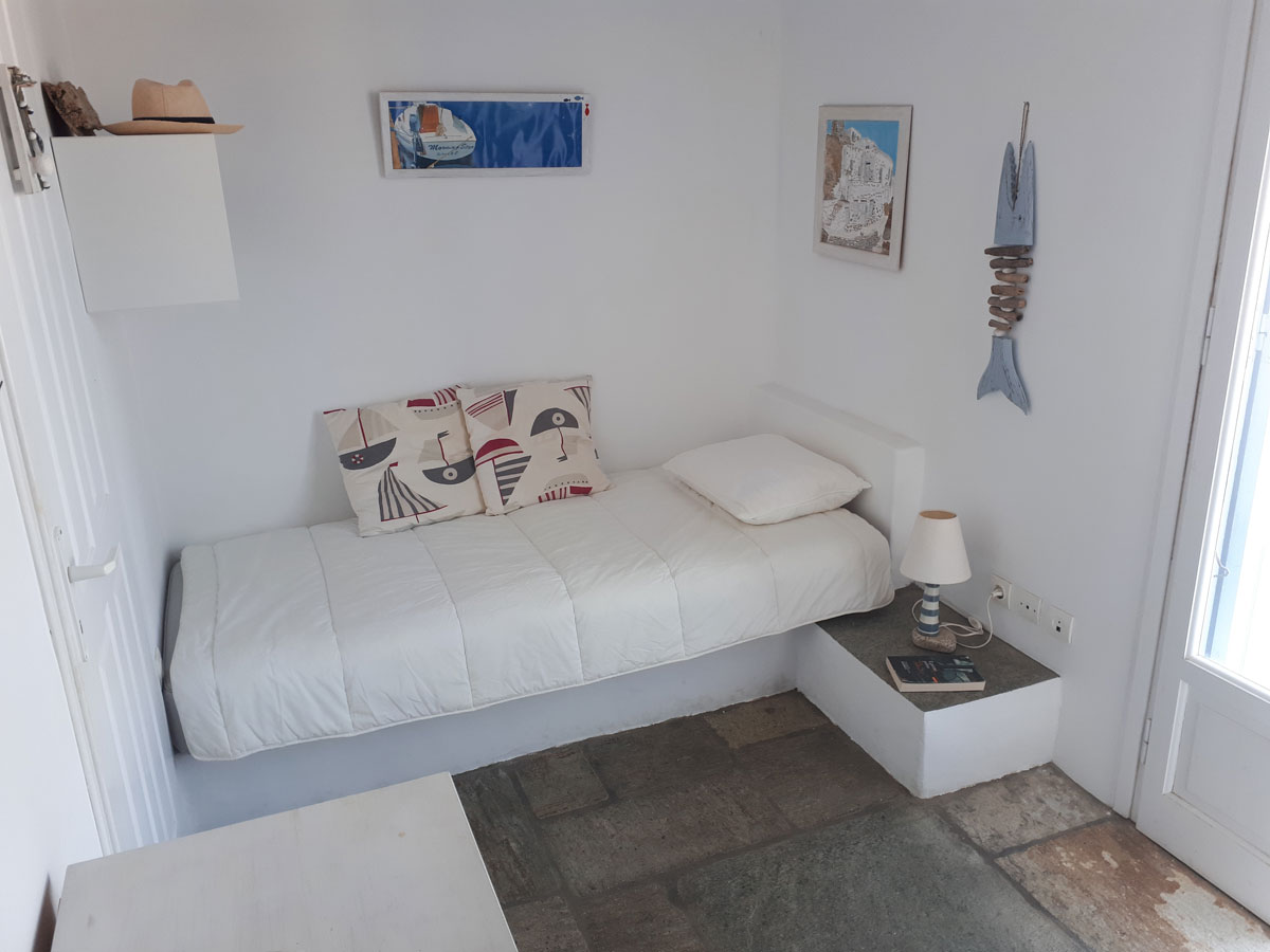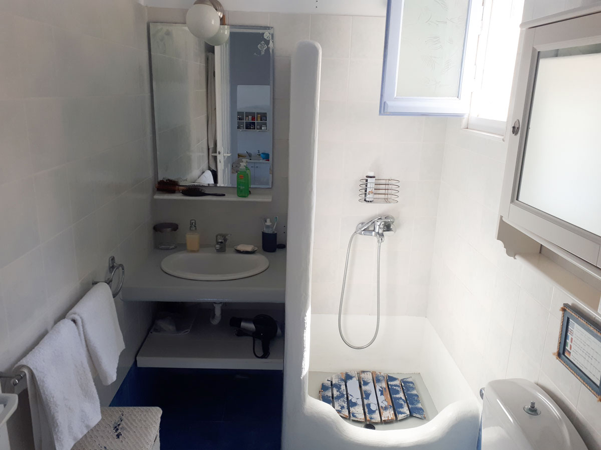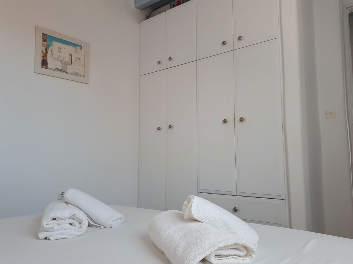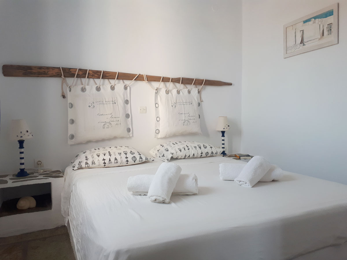 Confortevole appartamento in complesso di case in stile cicladico a Livadi: 1 camera da letto matrimoniale, 1 camera da letto con letto singolo, bagno, soggiorno con cucina attrezzata e terrazza con vista sul mare e su Chora. A 100 metri dal centro e a 250 metri dalle spiagge di Livadakia e Avlomonas.