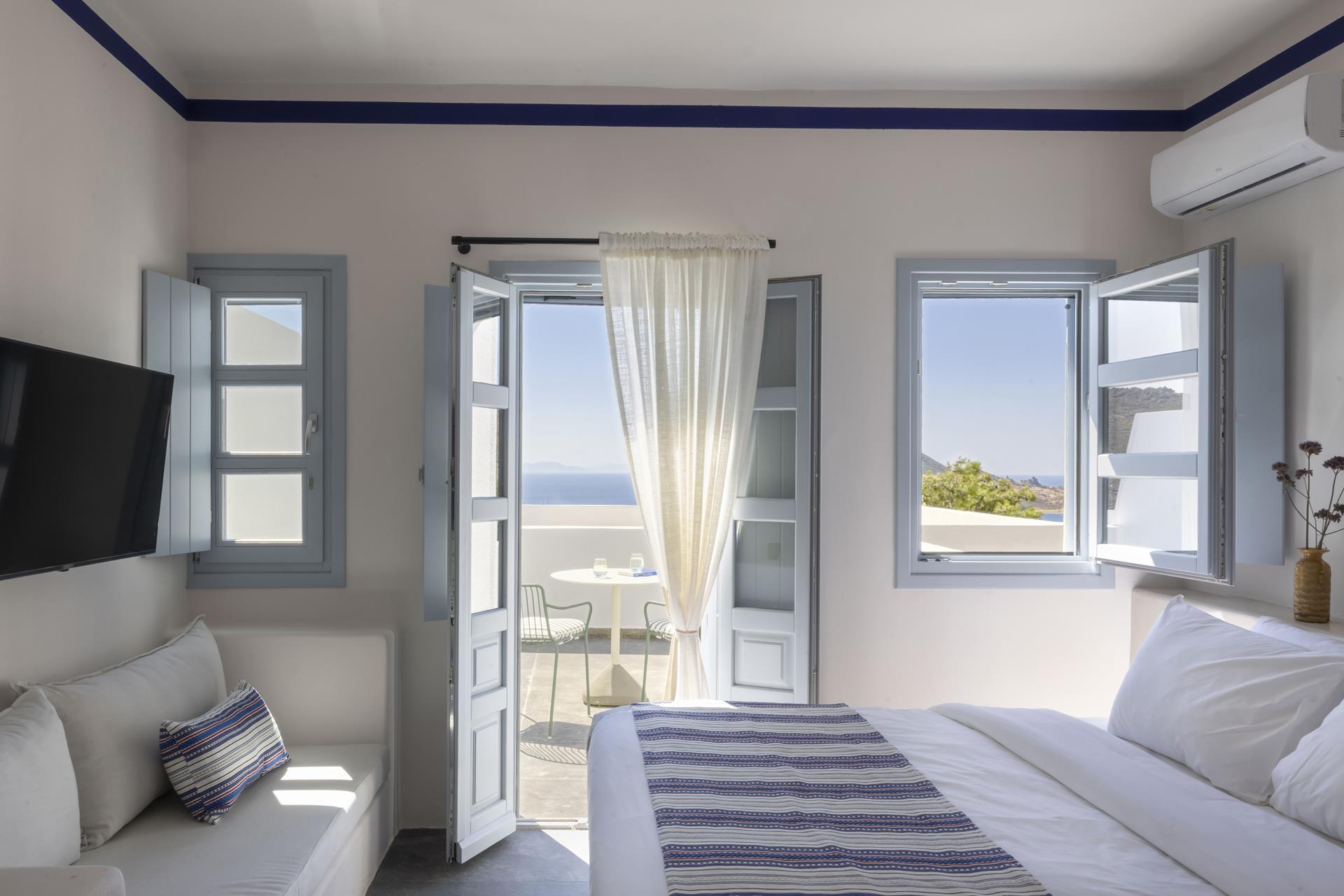 • Patmos Suite – 44 m² + 21 m² outdoor: La suite di punta della struttura: spaziosa (44 m²) con un grande spazio esterno (21 m²) dove rilassarsi ammirando il panorama. Perfetta per chi cerca comfort superiore, vista mozzafiato e un’esperienza completa sull’isola.